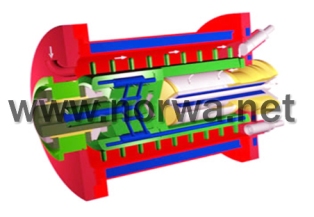 NORVA諾研高效納米砂磨機(jī)采用銷(xiāo)棒式結(jié)構(gòu)設(shè)計(jì),物料隨著進(jìn)料泵由頂端進(jìn)入研磨腔,隨著轉(zhuǎn)子的旋轉(zhuǎn)而均勻分布,在轉(zhuǎn)子和定子縫隙內(nèi)渦流離心力的作用下對(duì)物料進(jìn)行了徹底的預(yù)分散處理。在接下來(lái)強(qiáng)烈的研磨中,轉(zhuǎn)子棒銷(xiāo)和定子對(duì)研磨介質(zhì)連續(xù)發(fā)生劇烈的撞擊變化,研磨介質(zhì)再作用于物料,物料得以研磨,研磨后的物料在研磨腔停留時(shí)間特別短,從而得到一個(gè)極窄的產(chǎn)品粒度分布帶,在進(jìn)料泵壓力和離心力作用下,由于密度的不同,研磨介質(zhì)返回研磨腔,物料卻沿著離心力相反的方向經(jīng)縫隙式分離器過(guò)濾分離,循環(huán)往復(fù)。 |
